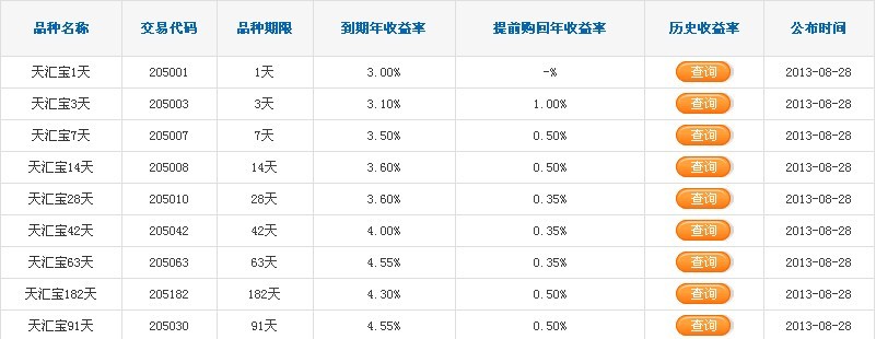 “天汇宝”各期限品种最新报价