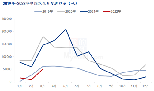 截至2022年3月,进口花生总量为76248吨,与去年同期相比减少207105吨,降幅为73%。2022年3月进口花生量与去年同期相比仍然存在着较大的差距。到港量少的原因首先是因为新冠疫情的影响下,船期缓慢,其次是因为国内花生价格相对较低,从性价比方面来讲,国内花生存在较大优势,导致进口米的需求较差。毕竟进口米压榨后缺少了国内花生油的风味。
