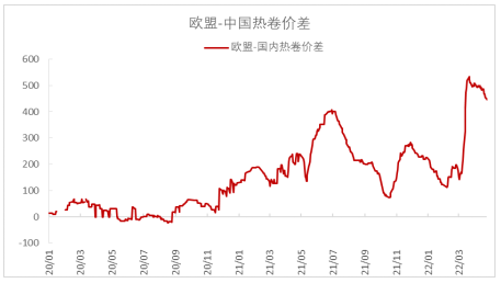 俄乌战争后欧洲原料及成品价格跳涨,原料推涨成品价格趋势明显,总体价格区间已到至近两年高位。于此同时热卷(4756, 92.00, 1.97%)、板坯等内外价差拉大,国外订单流向国内各大钢厂,导致国内板材价格高企。海外成本端由于欧美等国家对俄罗斯能源的制裁,煤炭等能源价格飙升,天然气价格同比涨幅达到280%,叠加高位高通胀-高工资螺旋上升,整体欧美形成原料成本、人员成本提升,成品价格居高不下。4月份开始,伴随着欧洲第一波补库完毕,海外成材价格高位松动回落,但内外价格依旧处于历史高位,或许只有俄乌冲突缓解全球供应回升或国外需求直线下行时,价差才有希望回到水平。
