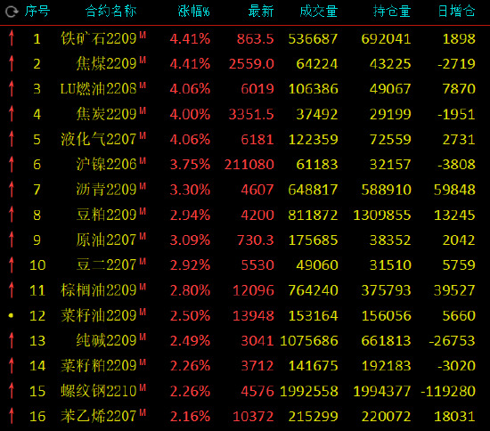 期市多品种收涨:铁矿石、双焦涨超4% 沥青、SC原油涨超3%