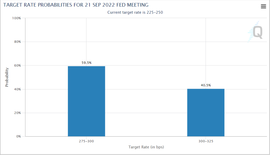 根据芝商所的统计,当前市场预期美联储9月加息50个基点的概率约为六成,小于美联储6月和7月每次加息75个基点的幅度。
