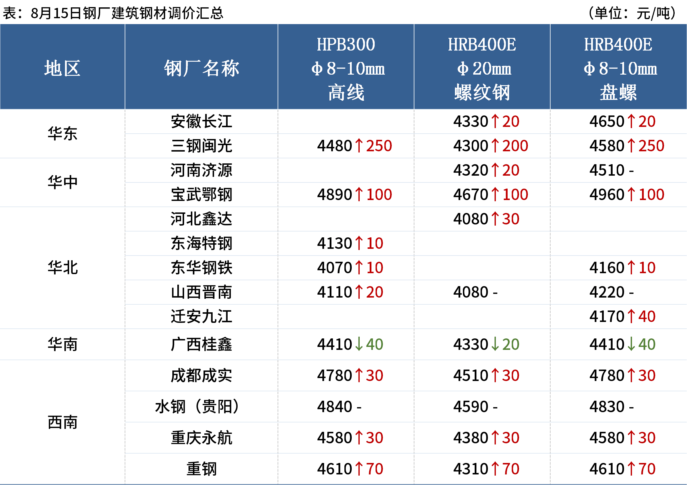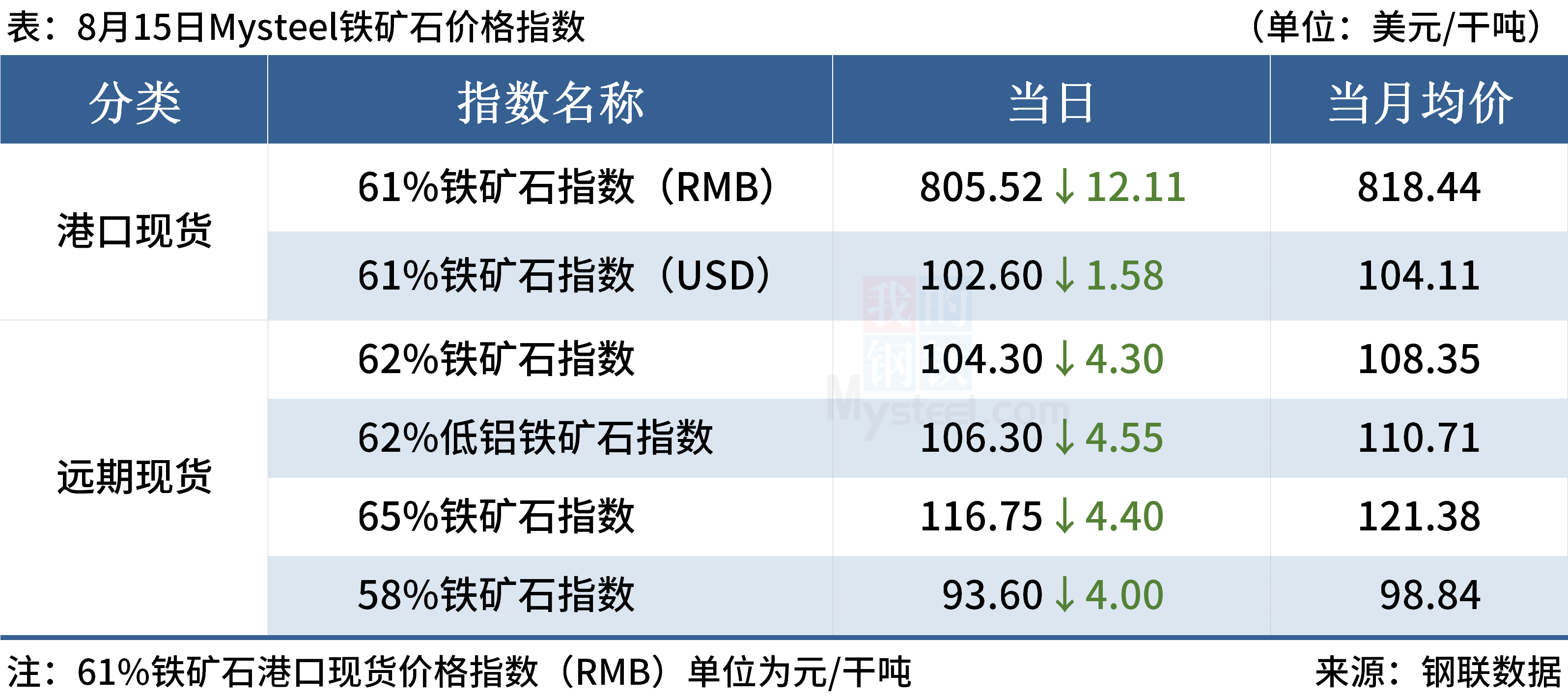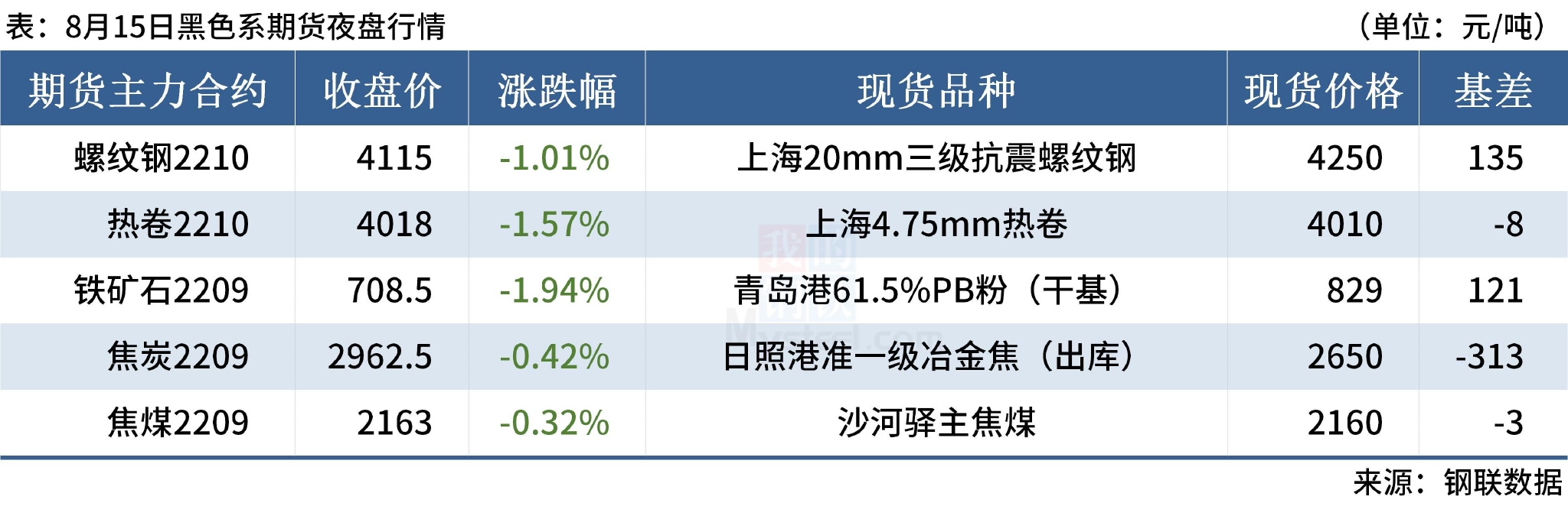 ◎ 8月15日,全国主港铁矿(723, 0.00, 0.00%)石成交94.50万吨,环比减15.3%;237家主流贸易商建材成交13.49万吨,环比减12%。