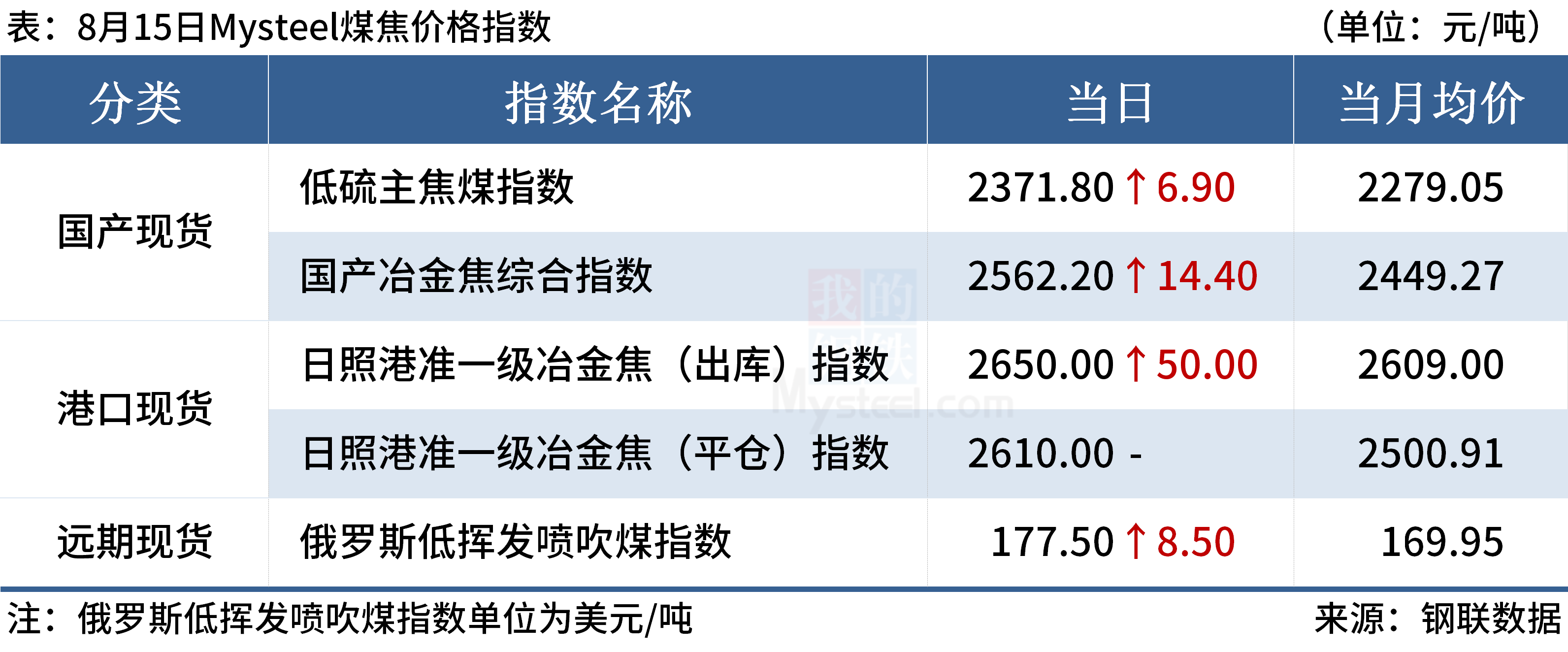 ◎ 邢台、定州、山东市场焦炭(3007, 32.00, 1.08%)价格计划提涨,湿熄焦上调200元/吨、干熄焦上调240元/吨,自8月16日0时起执行。