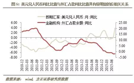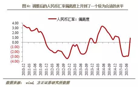 我们用外汇占款与人民币汇率同比进行回归,余项可以看作人民币汇率的偏离度。可以看到,人民币汇率的偏离度在今年年中时已经达到了3年来的新低水平。可以看到,随着资本市场的见顶回落,经济基本面对汇率的主导性影响又重新浮出水面,在去年5月到今年5月这一年的过程中,资本市场已经使得汇率出现了偏离基本面的升值,而当资本市场这个因素褪去之后,汇率在向基本面回归的过程中积累了大量的贬值压力,这才是8月人民币汇率一次性调整的重要原因之一。