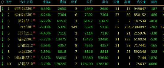 宁证期货午评:国内期货主力合约大面积飘绿 燃油、SC原油、棕榈跌超6%