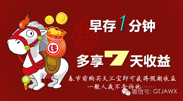 还记得18年前国君湖畔的天汇宝吗?对,就是那个一直在你身后默默无闻的天汇宝!假期前任何一天申购,春节期间依然计息,你没有听错,假期依然计息哦!