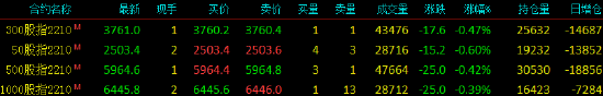 2022年10月20日,股指期货小幅下挫,沪深300股指期货(IF)主力合约跌0.47%,上证50股指期货(IH)主力合约跌0.60%,中证500股指期货(IC)主力合约跌0.42%,中证1000股指期货(IM)主力合约跌0.39%。