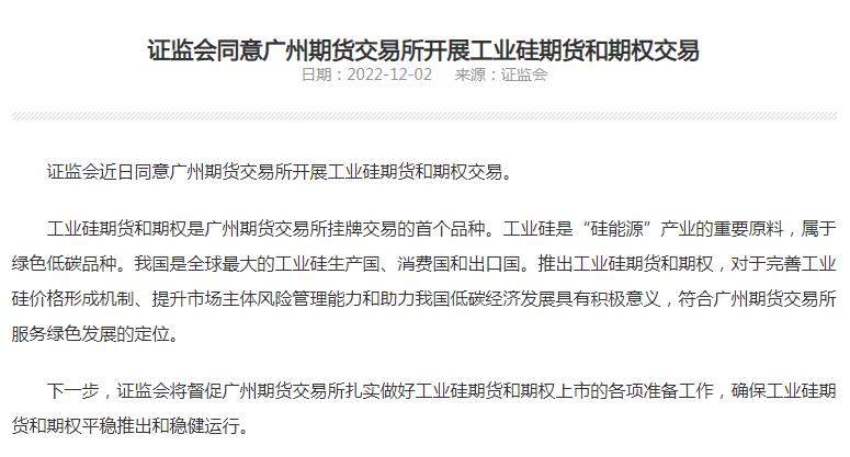 证监会12月2日发布通知,同意广州期货交易所(以下简称广期所)开展工业硅期货及期权交易。工业硅期货和期权是广州期货交易所挂牌交易的首个品种。