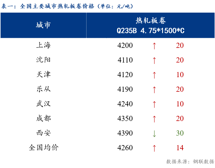 3.0mm热轧板卷全国均价4320元/吨,较上个交易日上涨13元/吨。4.75mm热轧板卷全国均价4260元/吨,较上个交易日上涨14元/吨。其中主要城市价格为上海4200元/吨,沈阳4110元/吨,天津4120元/吨,乐从4190元/吨,武汉4240元/吨,成都4350元/吨,西安4390元/吨。