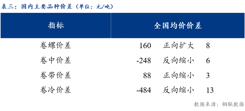 从品种价差来看,卷螺差较上一交易日扩大8元/吨,热中价差较上一交易日缩小6元/吨,热带价差较上一交易日缩小3元/吨,热冷价差较上一交易日缩小13元/吨。