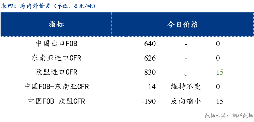 从海内外价差情况来看,中国热卷出口维持在640美元/吨左右,欧盟进口价格830美元/吨,较上一交易日下跌15美元/吨。