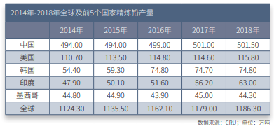 2018年全球精炼铅产量继续保持增长,达到1186.30万吨,较2017年增加 0.62%。从主要的生产国家来看,中国是全球最大的精炼铅供应国,2018年产 量501.50万吨,约占全球总产量的42.20%。美国、韩国、印度、墨西哥是重要 的生产国,分别排名世界第二到第五位。上述五国精炼铅产量约占全球总份额 的67.27%。其中,中国2018年精炼铅产量501.50万吨,较2017年增加0.10%,产量增速继续放缓;美国精炼铅恢复增长,2018年产量115.80万吨,较2017年 增加1.05%;韩国精炼铅产量恢复增长,2018年产量74.80万吨,较2017年增加 0.13%。