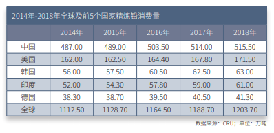 受益于通讯行业的增长,中国2018年精炼铅消费515.50万吨,较2017年增加 0.29%;美国2018年消费171.50万吨,较2017年增加2.21%;韩国2018年消费量 63.00万吨,较2017年增加0.80%,德国2018年消费量41.30万吨,较2017年增加 1.98%。