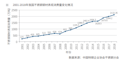 不锈钢以其良好的耐腐蚀、耐热、耐低温等性能被广泛应用于餐具、家用 电器、机械制造、建筑装饰、煤炭、石油化工等领域。比如具备强度高、加工性 好、淬火后硬度高、有磁性的马氏体不锈钢,能用于生产餐具、刀刃、机械零 件、涡轮机叶片等对硬度要求较高的产品;具备良好的耐腐蚀、耐热性、低温强 度和机械特性,冲压、弯曲等热加工性好、无磁性的奥氏体不锈钢,能用于众多 家用电器、汽车配件、医疗器具以及建材、食品工业、农业等领域;添加了钛元 素、具备高温耐腐蚀性及高温下强度较好的铁素体不锈钢,能用于生产汽车排气 管、热交换机、集装箱等产品。我国不锈钢产业起步较晚,建国以来到改革开放 前,不锈钢的需求主要是以工业和国防尖端使用为主。上世纪90年代后,尤其是 进入新世纪以来,我国不锈钢消费量增势强劲。2001年我国不锈钢表观消费量达 到225万吨,超过美国成为世界第一消费大国。2008年受全球金融危机的影响, 我国不锈钢表观消费量为624万吨,同比下降5%,出现了近15年来的唯一一次负 增长。之后,又恢复增长态势,2018年我国不锈钢钢材表观消费量达到了2132万 吨。