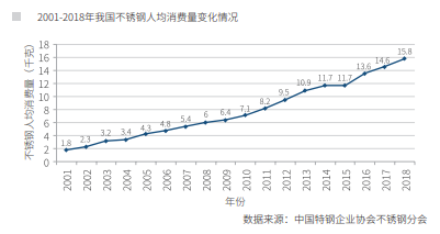 经过十几年的高速发展,2018年我国人均不锈钢消费量达到15.8千克(2001 年只有1.8千克),远远高于世界平均水平,但与先进工业化国家相比还有较大差 距。我国目前的人均不锈钢消费量只有意大利和韩国的1/2左右,耐腐蚀材料及 耐高温材料只有20万吨/年,全球占比仅为1%,远低于美、德、法、日。