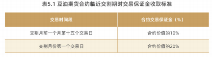 豆油期货合约的最低交易保证金为合约价值的5%。交易保证金实行分级管理,随着期货合约交割期的临近,交易所将逐步提高交易保证金比例。