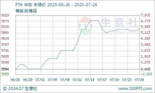据生意社商品行情分析系统,国内PTA市场行情在经历短暂回落之后,近期呈现震荡小幅上行态势,截止7月26日华东地区现货市场均价在5916元/吨,较7月18日上涨0.58%。