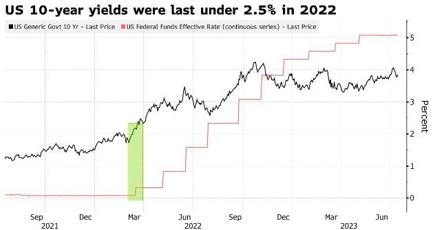基准的10年期美国国债收益率已经从去年10月份的峰值下降了近半个百分点,至3.84%左右,有迹象表明美联储的加息活动可能即将结束。若10年期美国国债收益率下降150个基点,该收益率将降至2.34%左右,这将是自2022年初以来的最低水平。