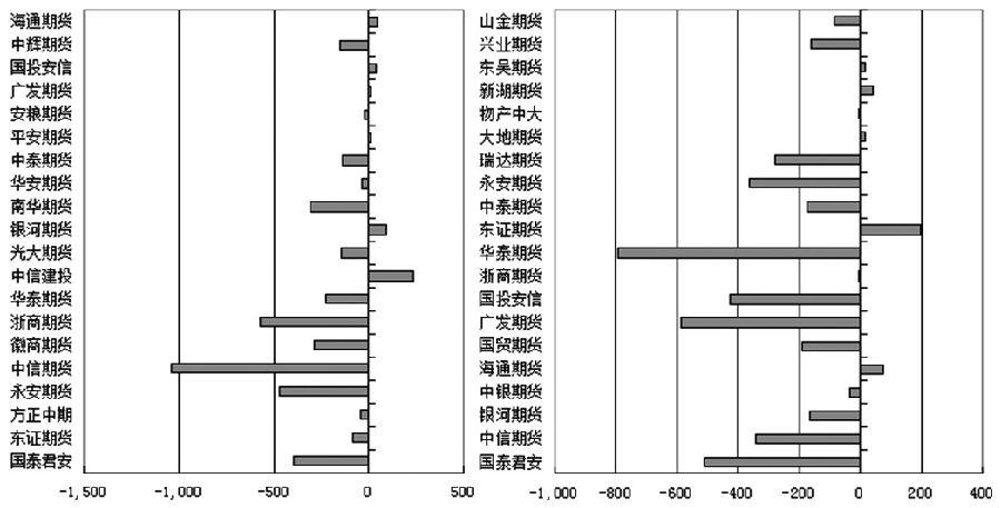 空头前20席位中,减持空单的席位有15家。其中,减持数量超过500手的有3家,分别为国泰君安期货席位、广发期货席位和华泰期货席位,分别大幅减少511手、588手和792手。减持数量介于100手至500手的有8家,分别为中信期货席位、银河期货席位、国贸期货席位、国投安信期货席位、中泰期货席位、永安期货席位、瑞达期货席位和兴业期货席位,分别减少341手、167手、190手、427手、172手、363手、281手和163手。其余4家席位增持数量不足100手。