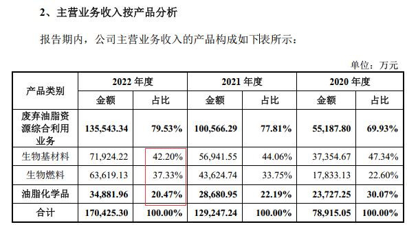也就是说,丰倍生物的“加工地沟油”生意要复杂得多。据招股书(申报稿)介绍,该企业形成了“废弃油脂-生物燃料(生物柴油)-生物基材料”的废弃资源再生产业链,此外还依托自身油脂综合利用核心技术和渠道优势为客户提供油脂化学品。