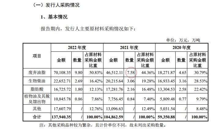 招股书(申报稿)披露,2020年~2022年,丰倍生物采购废弃油脂的均价分别为3927.61元/吨、6134.36元/吨及7155.08元/吨,后两年同比增加56.19%、16.64%;对应年度采购量分别是4.65万吨、7.58万吨以及9.8万吨。