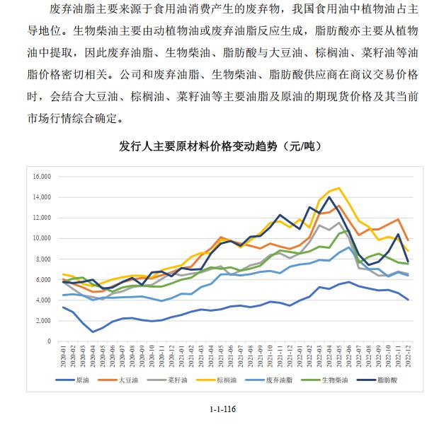 丰倍生物招股书(申报稿)中披露了报告期内原油、大豆油、菜籽油等原材料价格变动趋势,仔细对比可以发现,废弃油脂的价格在2020年初、2021年中以及2022年中均一度超过菜籽油价格。自2022年下半年开始,各种油类原材料价格下跌,废弃油脂也一度超过了生物柴油的价格。