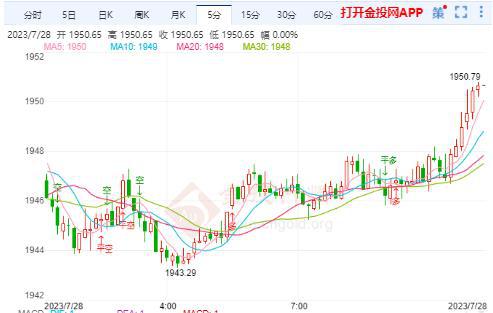 金投网7月20日讯,周五(7月28日)国际金价升至一周新高后出现回调趋势,目前交投于1950美元附近。美元指数收窄跌幅限制了金价涨势,交易员消化了美联储主席鲍威尔在普遍预期加息后发表的相当平衡的言论。关注日内稍后公布的欧洲央行政策决定,欧洲央行的鹰派立场可能会成为金价的阻力。
