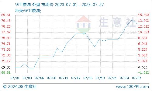 成本端重心走强助推PTA市场,在供需面和宏观面的共同推动下,国际原油价格重心自6月底开始不断上移。沙特和俄罗斯进一步推进减产,供应收紧预期不改,以及美国汽油需求回升,国际原油价格持续攀升。截止7月27日,美国WTI原油期货主力合约结算价报80.09美元/桶,布伦特原油期货主力合约结算价报83.79美元/桶,WTI三个月来首次破80美金。PX市场在一季度由于集中检修进入去库通道,尽管当前装置部分复产,不过需求端PTA开工一直保持在偏高水平,PX维持紧平衡格局。