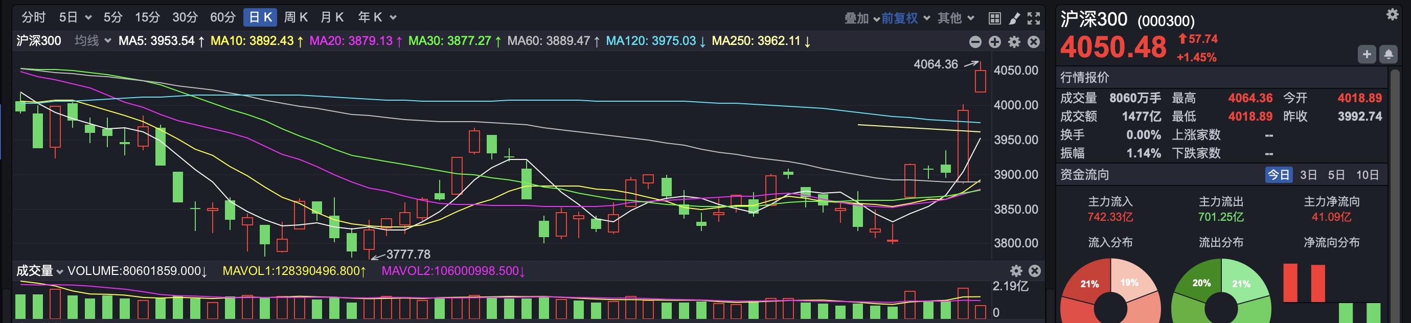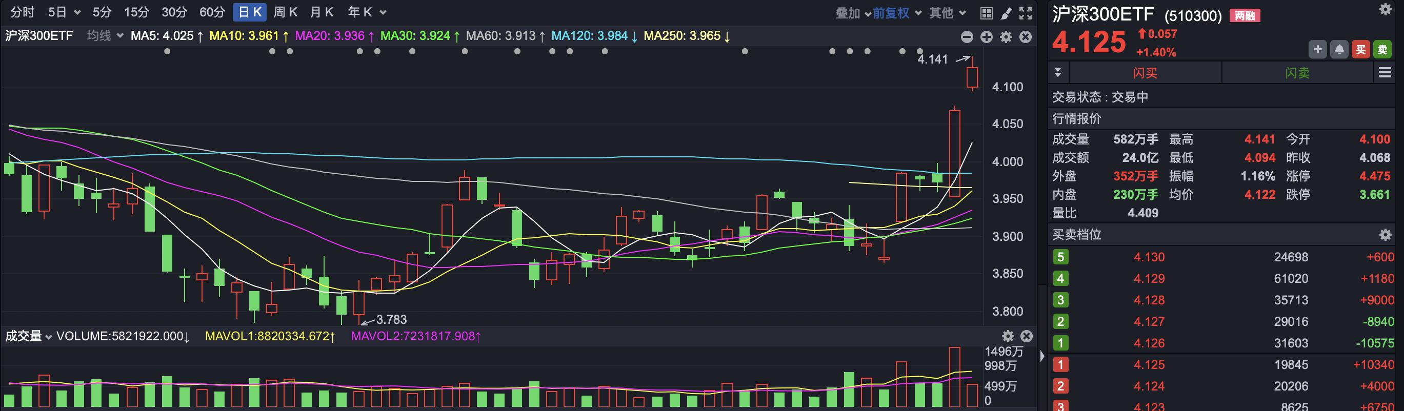 7月31日早盘,沪深300ETF(510300)显著放量,开盘半小时成交超20亿元,涨幅1.13%,创下4月19日以来新高。沪深300ETF跟踪沪深300指数,该指数代表A股市场核心资产,其走势也是整个A股市场牛熊晴雨表。今年以来,沪深300指数累计上涨4.53%,若判断未来A股迎来一波牛市,沪深300指数必然引来复苏性行情。