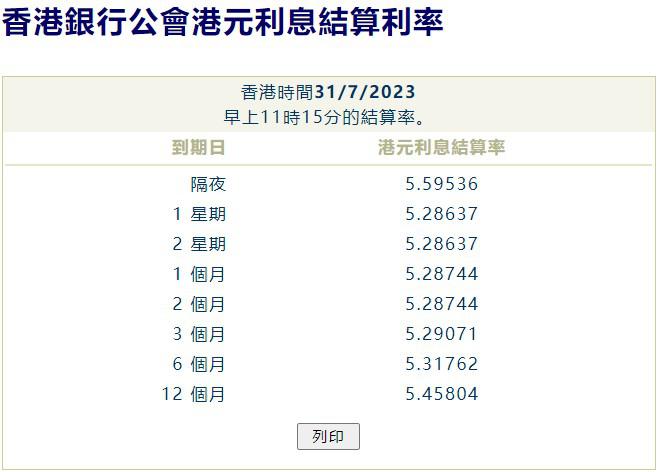 7月31日消息,港元拆息目前普遍势好,其中,隔夜息反弹近37基点至5.59536%,创一个月以来新高,而与楼按相关的一个月拆息连升四天,至5.28744%,与同期美元LIBOR息差收窄至15基点。反映银行资金成本的三个月拆息升至5.29071%,与同期美元LIBOR息差维持34基点。不过,一周及两周拆息双双回落至5.28637%。