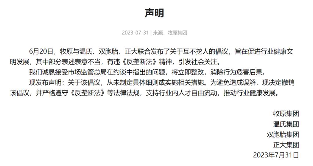 据了解,此前在6月20日的牧原开放日活动上,牧原联合温氏、双胞胎、正大向行业发出倡议,尊重行业秩序,打造商业文明,签署互不挖人公约。公约具体内容为:为减少内卷,文明发展,我倡议:不挖人,不拆台。如有违约,加倍反制。