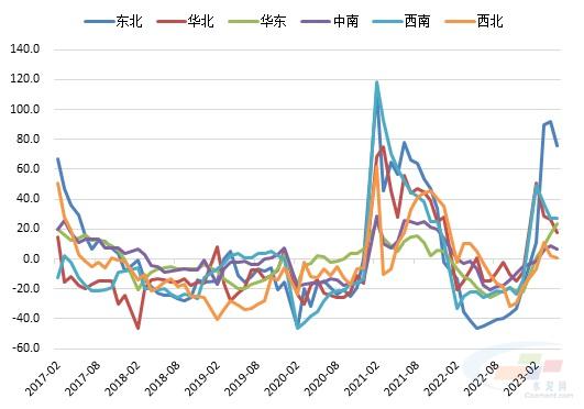 1-5月,全国各大区域竣工面积同比增速均有增长,其中东北、西南增幅最大,同比分别增长75.86%和27.14%。