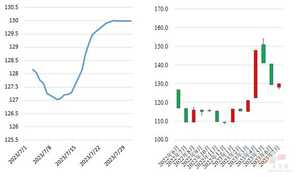 图1:2023年7月全国玻璃价格指数走势 图2:近1年玻璃价格指数K线图