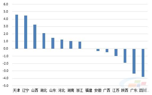 从15个样本省市的浮法玻璃价格来看,月内有半数省份价格回涨,其中涨幅在4%以上的有天津、辽宁2省,山西、湖北、山东等5个省份环比涨幅都在1~4%之间。四川、广东等6省环比下跌,跌幅均在4%不到。月内福建行情不变。具体情况参见下图。