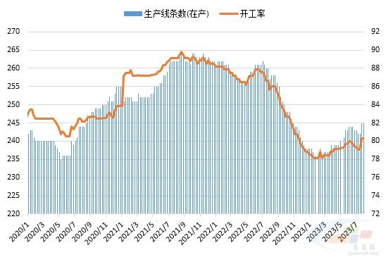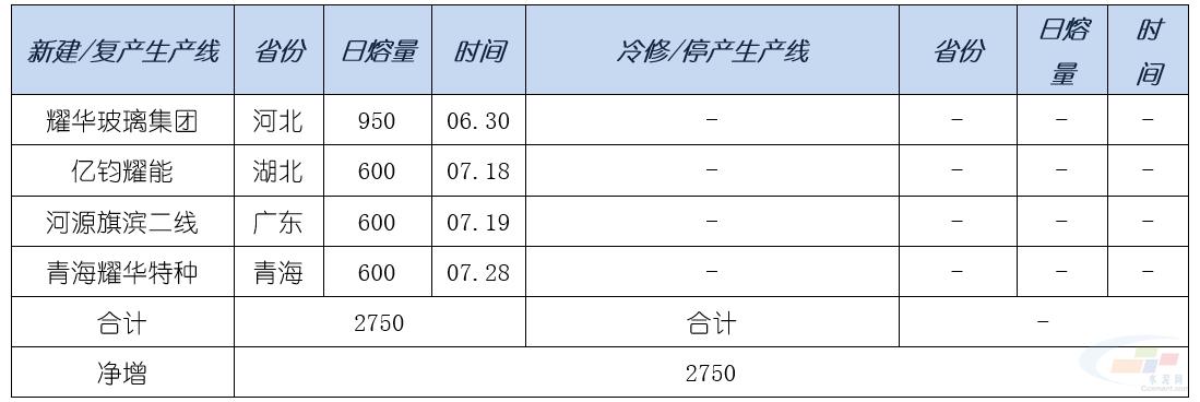 7月底,全国浮法玻璃生产线共有307条,与6月份相比增加一条。6月30日中国耀华玻璃集团有限公司950吨/天等量搬迁退城入园项目点火投产(7月纳入统计),除此以外7月还有3条生产线复产,无冷修生产线。月内日熔量净增加2750 t/d,总体来说7月产能有所上升,预计7月浮法玻璃的产量环比会有所上升。月内无冷修,浮法原片玻璃企业开工率有所上升,月末升至80.33%。