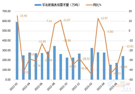 7月浮法玻璃需求环比上升,据测算7月浮法玻璃表观需求量为242.14万吨,同比下降15.81%,环比回升41.18%。