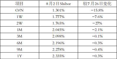 受月末资金需求高峰结束以及市场整体资金需求疲软的影响,本周国内市场利率呈现全面下降态势。截至8月2日,上海银行间同业拆放利率(Shibor)隔夜、1周期、2周期、1月期、3月期、6月期、9月期、1年期利率分别报收于1.301%、1.777%、1.765%、2.045%、2.098%、2.196%、2.278%和2.335%,较7月26日分别下降15.8、7.6、27、2.1、0.1、0.3、0.4和0.3个基点。