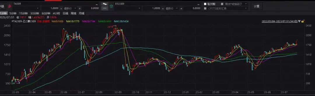 近期,PTA与乙二醇价差持续走强,目前PTA2309合约与乙二醇2309合约价差稳步上行至1800元/吨一线,创近一年新高。