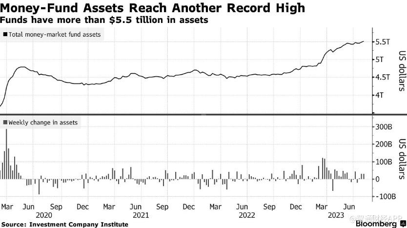 由于5%以上的利率吸引了银行和其他短期投资的资金,美国货币市场基金资产规模攀升至新高。据美国投资公司协会的数据,截至8月2日的一周,约有290亿美元流入美国货币市场基金,总资产达到5.52万亿美元,前一周为5.49万亿美元。