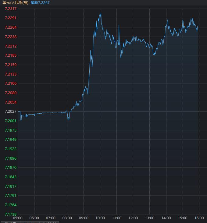 这或许与人民币兑美元汇率出现反弹有关。今天盘中,离岸人民币汇率是下图这样的。从上周五至今,离岸人民币汇率从7.1554贬至7.22上方,而北向资金也连续两日净卖出。