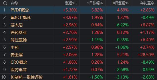 盘面上,医药股集体反弹,医药商业、中药方向领涨,精华制药、华森制药、龙津药业等涨停。传媒股继续活跃,出版传媒、金逸影视涨停。氟化工概念股震荡走强,联创股份涨超10%,巨化股份、永和股份涨停。氢能源概念股尾盘异动,致远新能20CM涨停,京城股份涨停。券商股表现分化,中金公司一度涨停,信达证券、哈投股份跌停。