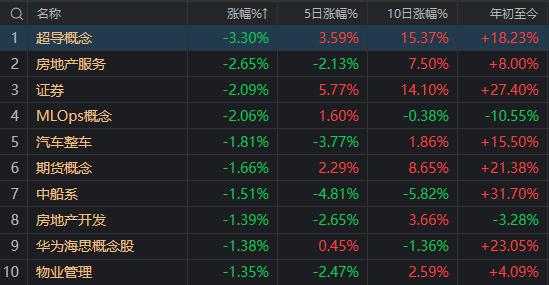 其次,今天领跌的板块,主要是此前半个月比较强势的超导概念、房地产、券商等。