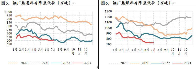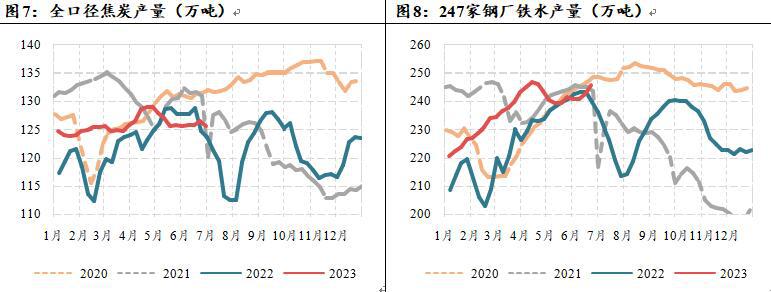 3.下半年铁水中枢或有回落。上半年随着焦煤下跌让利,钢厂利润得以修复,开工积极性较高,下半年粗钢依旧面临平控的可能。统计局的口径下,平控基础上,叠加废钢或有减量,维持全年铁水8.65亿吨的判断,今年1-5月铁水产量为3.74亿吨,6-12月预计为4.91亿吨,同比下降1000万吨,折算焦煤需求为3.17亿吨。以钢联的口径来看,在平控的基础上,全年铁水日均产量应该在230万吨左右,而上半年日均铁水的均值在237万吨,如果要实现平控,下半年的铁水均值需要降至225万吨左右,相比当前245万吨铁水有较大的下降空间,如果没有平控,预计下半年铁水均值或在235万吨。