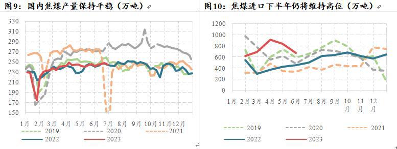 1.国内产量平稳,维持小幅增长判断。国内焦煤产量基本保持平稳,根据统计局的数据来看,今年1-5月,国内炼焦煤产量2.05亿吨,较去年同期仅增加了170万吨左右。同样,根据汾渭高频的数据来看,截至今年6月29日,样本煤矿精煤周均产量为235.5万吨,去年同期的周均产量为236.5万吨,各口径下焦煤产量均保持平稳,而新增产能有限。此外今年上半年虽然多次煤矿事故发生,但是整体对生产的影响较小,预计下半年国内产量将继续保持平稳,维持今年产量4.96亿吨判断(此前年报预估4.96亿吨,去年4.94亿吨)。