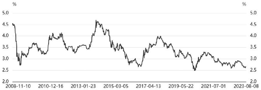 市场情绪角度,主要关注股债跷跷板效应和市场对国债收益率底部的预期。7月24日中央政治局会议提出加强逆周期调节及活跃资本市场、当天的证监会2023年系统年中工作座谈会提出综合施策深化资本市场改革开放,股市情绪受到提振,债市受到短暂冲击,期债在7月25日跳空下行,T2309合约日内跌幅达0.52%,创年内最大单日跌幅。随后几日,期债企稳并重回上行通道。可以看出,市场对债市仍保持看多的态度。此外,近20年来,十年期国债收益率经历多个周期,底部均在2.6%附近,当前收益率一度低至2.65%下方,令市场预期利率已经接近底部。不过,当前银行存款利率多次下调,负债成本趋势性走低,从配置盘角度考虑,银行等机构对于债券投资的回报要求会随之降低,收益率底部可能仍有下行空间。