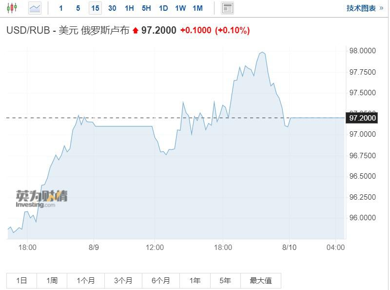 受强劲的外汇需求和有限的供应拖累,卢布在周三盘中早些时候一度跌至1美元兑98.0725卢布,这是自2022年3月25日以来的最低水平,但在央行采取行动后,卢布几乎收复了所有失地。截至发稿,卢布兑美元汇率为1美元兑97.2卢布。