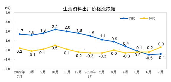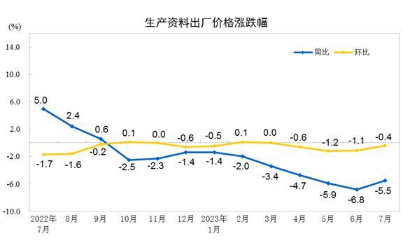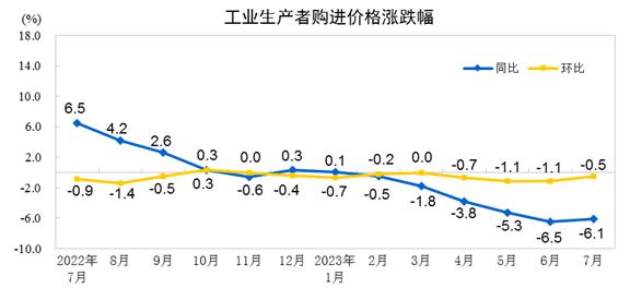 2023年7月份,全国工业生产者出厂价格同比下降4.4%,环比下降0.2%;工业生产者购进价格同比下降6.1%,环比下降0.5%。1―7月平均,工业生产者出厂价格比上年同期下降3.2%,工业生产者购进价格下降3.5%。
