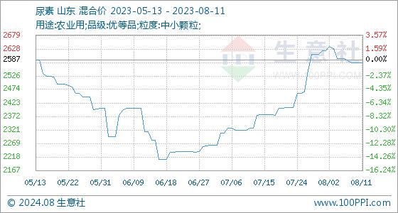 8月11日,生意社尿素基准价为2577.14元/吨,与本月初(2622.86元/吨)相比,下降了-1.74%。