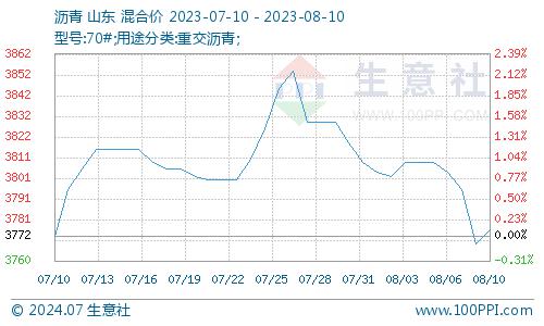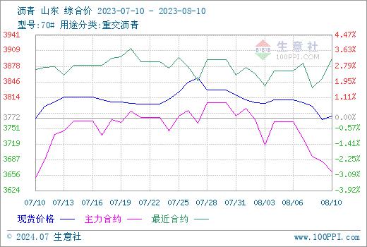 据生意社商品行情分析系统,沥青市场行情窄幅走低。8月7日至10日,山东地区沥青价格自3804元/吨下跌至3776元/吨,跌幅0.74%,环比上涨0.09%,同比下跌13.53%。国际原油偏坚挺运行,但成本支撑有限,供应端继续维持高位,需求仍显一般,沥青市场行情短期偏弱。