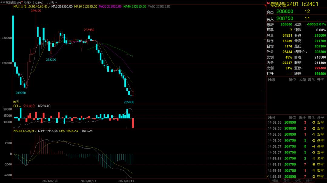 “经过一段时间的博弈,市场已经基本认可8月份现货较LC2401合约价差在35000元/吨左右(以SMM电池级碳酸锂为现货基准),现货的下跌必然会给期货价格带来下行压力。”张维鑫认为,在悲观情绪和预期冲击下,2401合约跌破200000元/吨并非不可能。
